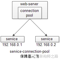 【站点层】到【服务层】的高可用,是通过服务层的冗余来实现的。“服务连接池”会建立与下游服务多个连接,每次请求会“随机”选取连接来访问下游服务。