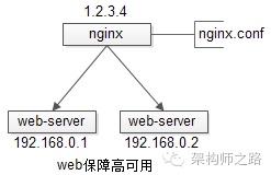 【客户端层】到【反向代理层】的高可用,是通过反向代理层的冗余来实现的。以nginx为例:有两台nginx,一台对线上提供服务,另一台冗余以保证高可用,常见的实践是keepalived存活探测,相同virtual IP提供服务。