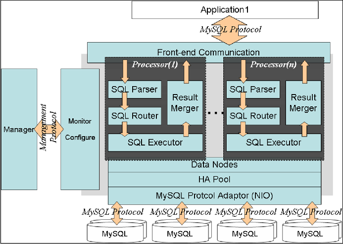 - 与应用之间通过MySQL protocol进行交互,是一个proxy的结构,对外暴露jdbc:mysql://CobarIP:port/schema。对应用透明。