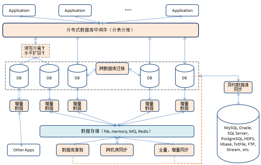 - 数据库与数据库之间会有数据迁移(同步)的动作,同款数据同步原理比较简单,比如MySQL主备同步,只要在数据库层进行相应的配置既可,但是跨数据库同步就比较复杂了,比如Oracle->MySQL。数据迁移一般包括三个步骤:全量复制,将原数据库的数据全量迁移到新数据库,在这迁移的过程中也会有新的数据产生;增量同步,对新产生的数据进行同步,并持续一段时间以保证数据同步;原库停写,切换新库。将“跨数据库”这个含义扩大一下——“跨数据源”,比如HDFS, HBase, FTP等都可以相互同步。(yugong, DataX)