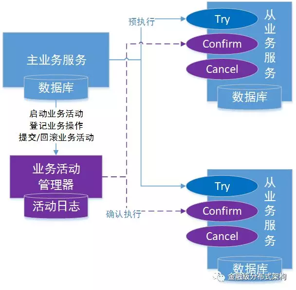 - 然后针对要调用的从业务服务,主业务活动先向业务活动管理器注册从业务活动,然后调用从业务服务的 Try 接口;