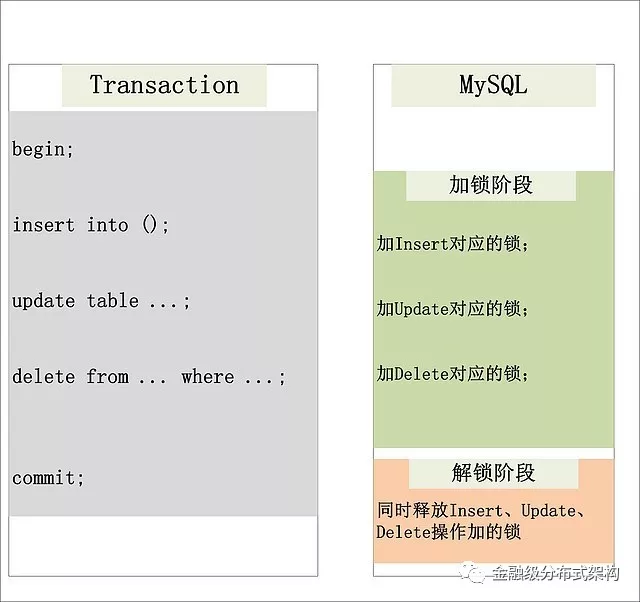 以 MySQL 来举例,MySQL 使用 2PL(Two-Phase Locking,两阶段锁)机制来控制本地事务的并发,保证隔离性。2PL 与 2PC 类似,也是将锁操作分为加锁和解锁两个阶段,并且保证两个阶段完全不相交。加锁阶段,只加锁,不放锁。解锁阶段,只放锁,不加锁。