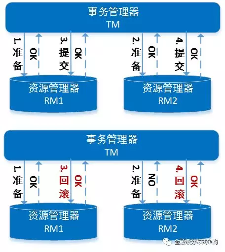 两阶段提交是指将提交过程分为两个阶段,即准备阶段(投票阶段)和提交阶段(执行阶段):