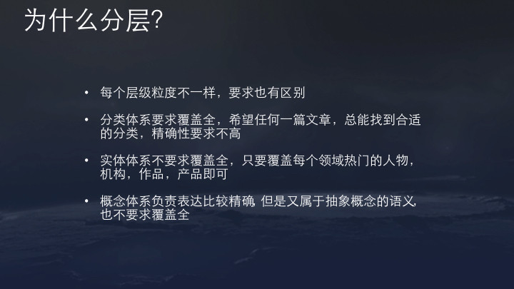 分类的目标是覆盖全面,希望每篇内容每段视频都有分类;而实体体系要求精准,相同名字或内容要能明确区分究竟指代哪一个人或物,但不用覆盖很全。概念体系则负责解决比较精确又属于抽象概念的语义。这是我们最初的分类,实践中发现分类和概念在技术上能互用,后来统一用了一套技术架构。