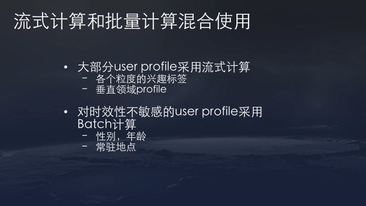 当然,我们也发现并非所有用户标签都需要流式系统。像用户的性别、年龄、常驻地点这些信息,不需要实时重复计算,就仍然保留daily更新。