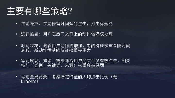 - 二、热点惩罚。对用户在一些热门文章(如前段时间PG One的新闻)上的动作做降权处理。理论上,传播范围较大的内容,置信度会下降。