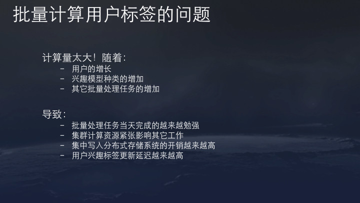 但问题在于,随着用户高速增长,兴趣模型种类和其他批量处理任务都在增加,涉及到的计算量太大。2014年,批量处理任务几百万用户标签更新的Hadoop任务,当天完成已经开始勉强。集群计算资源紧张很容易影响其它工作,集中写入分布式存储系统的压力也开始增大,并且用户兴趣标签更新延迟越来越高。