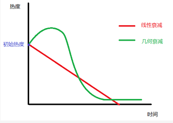 我们要求推荐给用户的新闻必须是24h以内,所以理论上讲,衰减算法必须保证在24h后新闻的热度一定会衰减到很低,如果是线性衰减,当某些新闻突然有大量用户阅读,获得很高的热度分时,可能会持续排名靠前很久,让用户觉得内容更新过慢