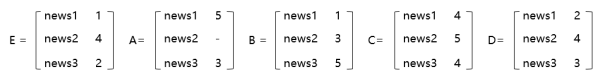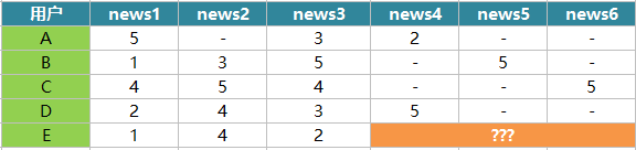 我们结合一个很小的实例来了解用户协同过滤的原理,包括如何计算用户之间的相似性和如何做出推荐。假设有A、B、C、D和E共5个用户,他们各自阅读了几篇新闻并做出了阅读,赞,收藏,评论,分享操作,我们对这几种行为赋予的分数分别为1分、2分、3分、4分和5分,这样用户对每条新闻都有自己的得分,其中“-”表示未阅读,得分如下: