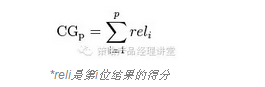 CG是在这个查询输出结果里面所有的结果的等级对应的得分的总和。如一个输出结果页面有P个结果,CG被定义为: