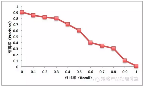 一般情况,对同一个策略模型,用不同的阀值,可以统计出一组不同阀值下的精确率和召回率关系,我们称之为P-R曲线,如下图: